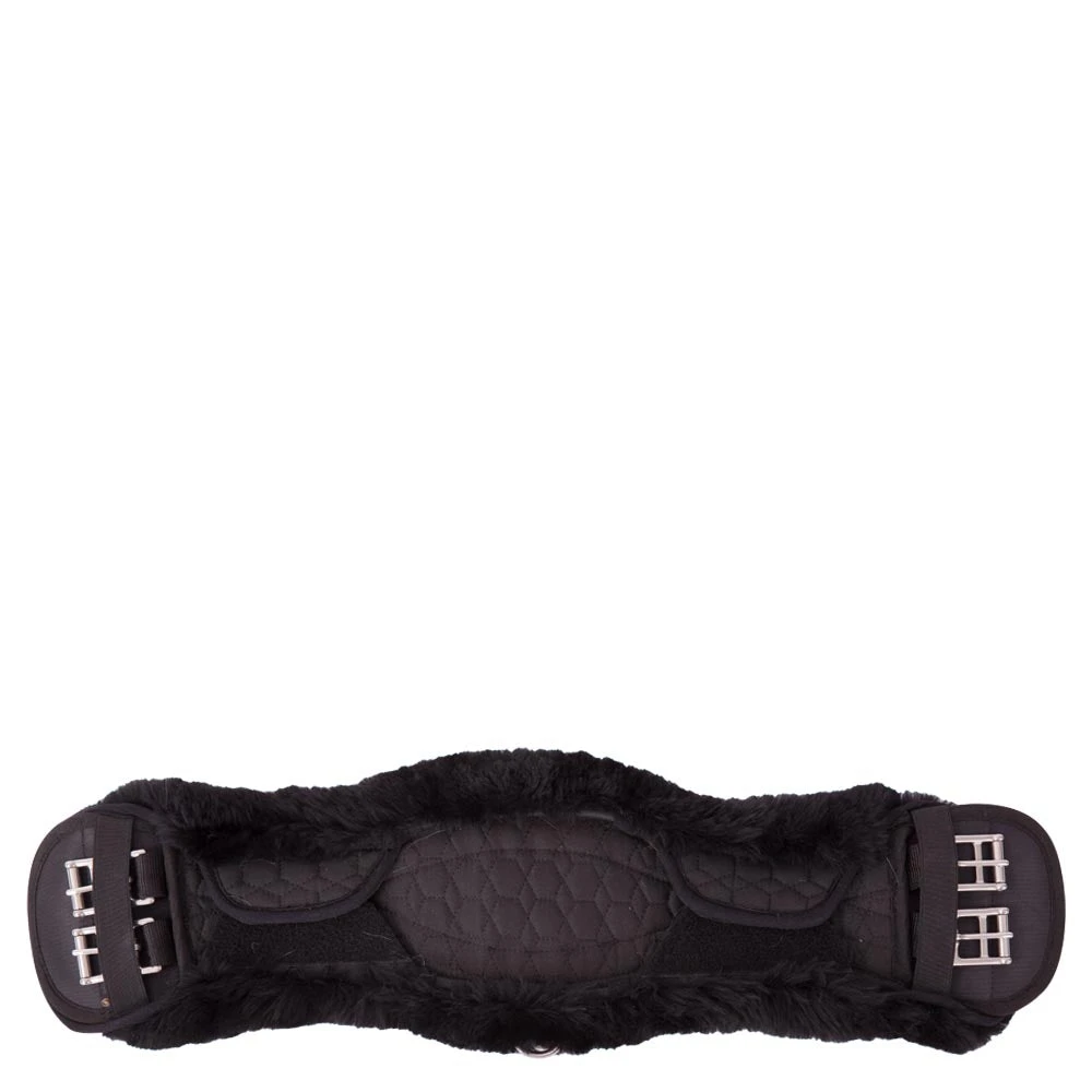 This anatomically shaped dressage girth in quilted polycotton has a soft lining made of natural sheepskin. This comfortable lining distributes and reduces the pressure of the girth and also prevents pressure sores and overheating. Medically tanned sheepskins are hygienic, sweat resistant and inhospitable to bacteria. Especially suitable for horses with sensitive skin. The lining is fully detachable using four strong Velcro fastenings and elastic straps on both sides. This allows the lining to be washed separately from the girth. The girth features stainless steel roller buckles with elastic on one side, making it easier to girth the horse. It also keeps the saddle sitting straight and correctly on the horse. The girth features two centre D-rings for attaching training aids. The anatomic shape of the girth gives the horse maximum freedom of movement.