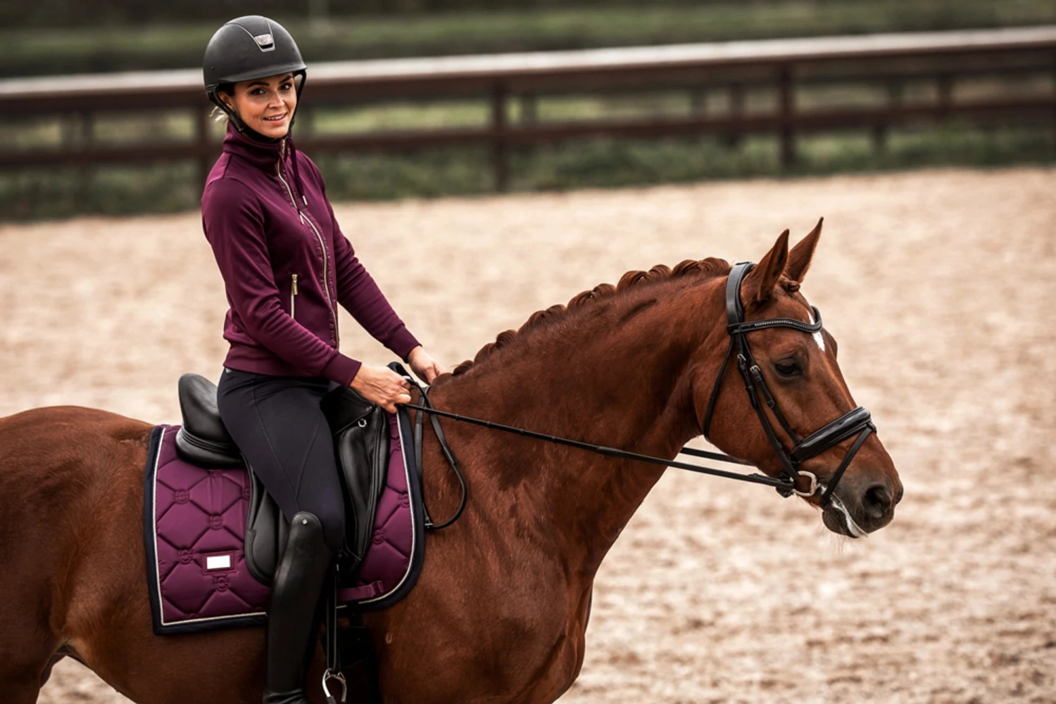 Add a color pop to your training sessions with this exclusive saddle pad! Elegant purple combined with golden details is truly a match made in heaven. The saddle pad is crafted in glossy, dirt repellent, material with the classic ES pattern. Style with other pieces from the same collection for a complete look.