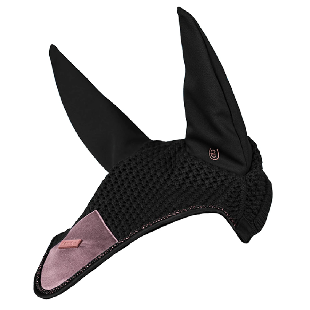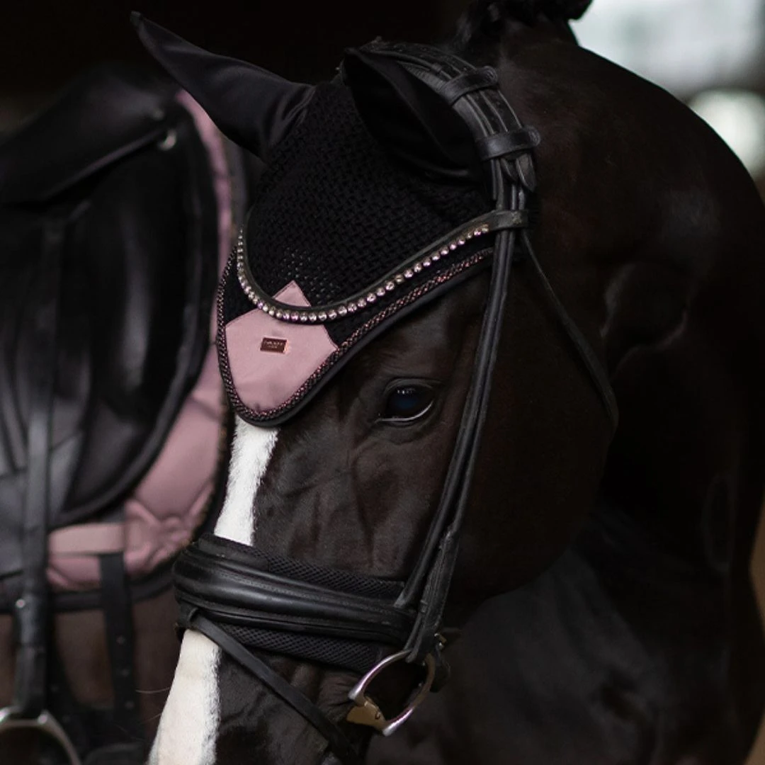 Luxurious crocheted ear bonnet in a elegant pink colour. Decorated with a pink satin patch on the front, beautiful piping and the edge border in black. Styled with Equestrian Stockholm badge in rose gold. The bonnet provides both insect protection and noise reduction. It has elastic cloth on the ears for extra comfort. This ear net matches perfectly with the saddle pad from the Anemone collection.