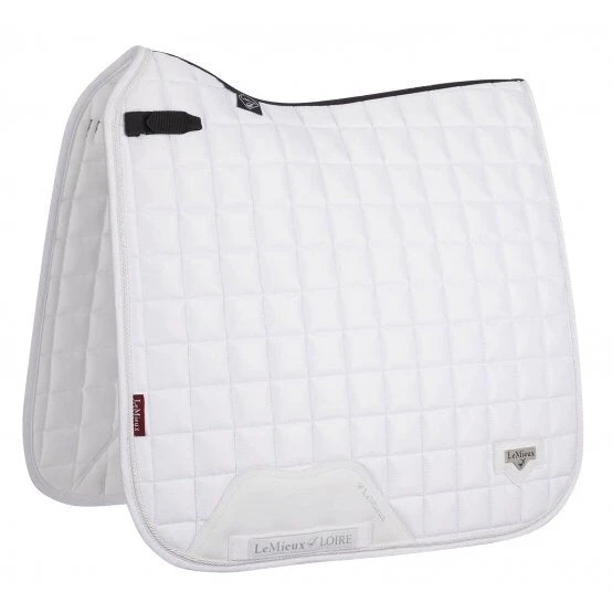 The textured PUÂ leather girth protection area is complimented by an embossed logo and carries the usual signature LeMieux lower girth strap with its inner locking loops. The piece de resistance of the Loire Dressage Square is its unique metal badge on a leather mount in the lower back corner.