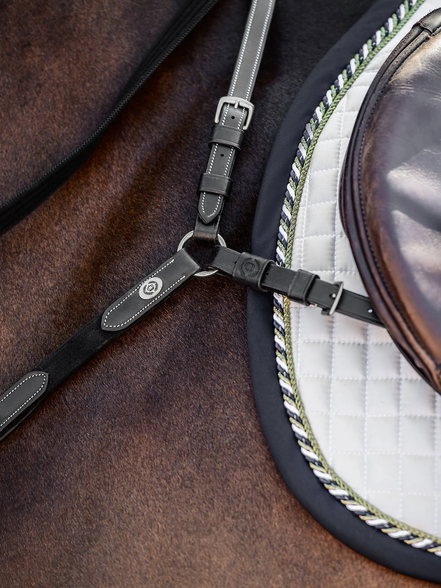 A well-worked breastplate, extra padded along the withers for additional comfort. The martingale is adjustable on both sides of the neck. The clever Snap It hooks make it unnecessary to open the reins to connect the equipment which is great both out of a practical and safety point of view.
