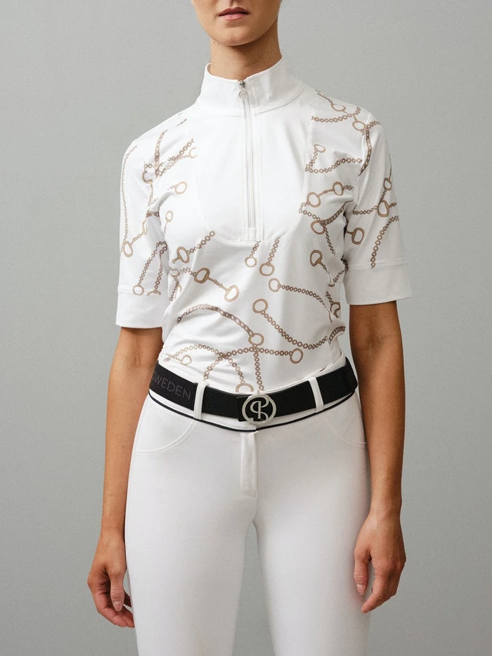 Short sleeve competition shirt made in a functional and stretchy jersey material that transports moisture away. Classic, white bib with a mock neck and zipper closure. Designed with an all-over-print that will give you a luxurious competition look.