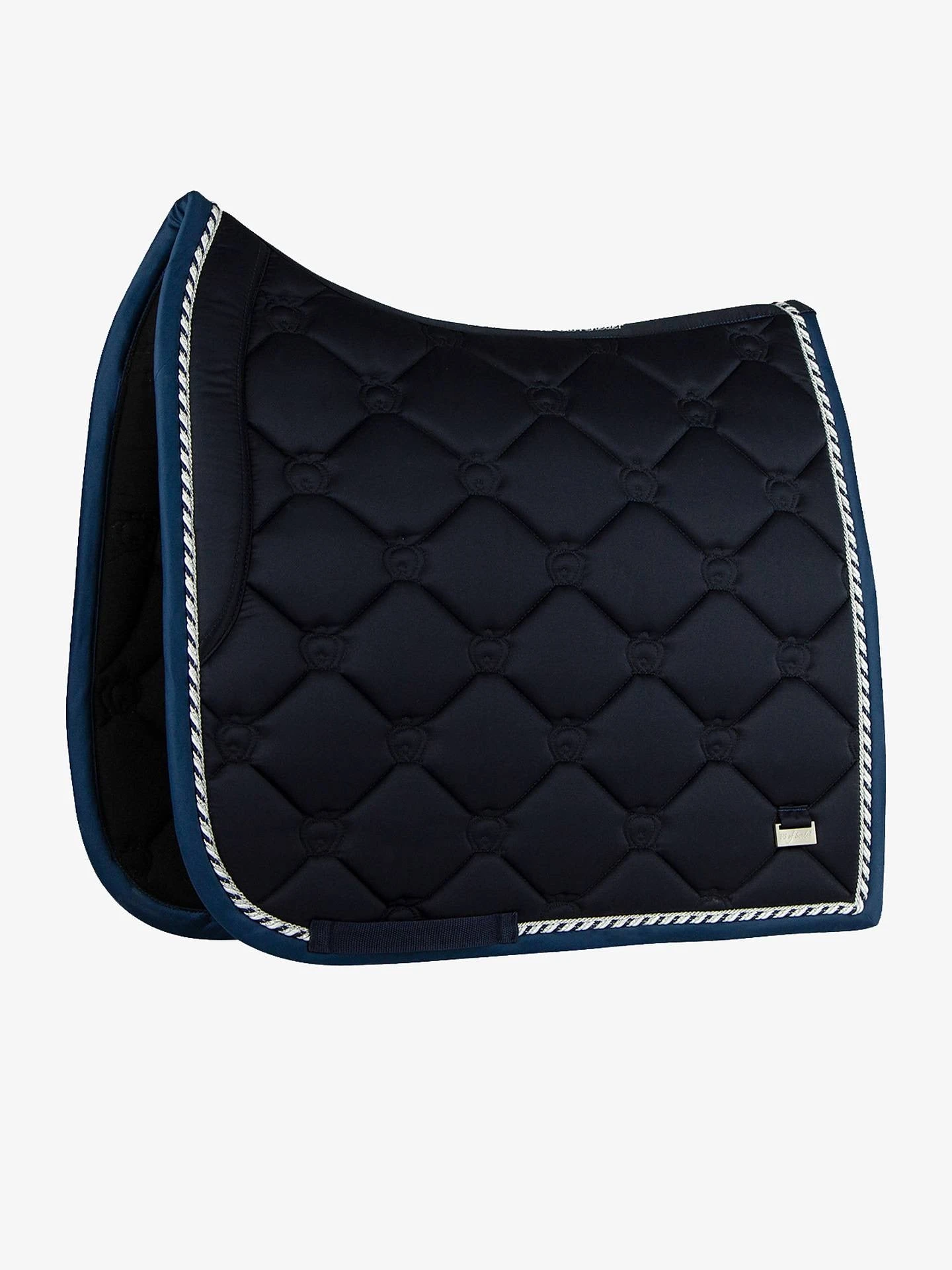 An anatomically designed saddle pad with double piping and quilted with PS of Sweden monogram. Luxurious, with details in silver. Unique quote embroidered on the back spine of the saddle pad.